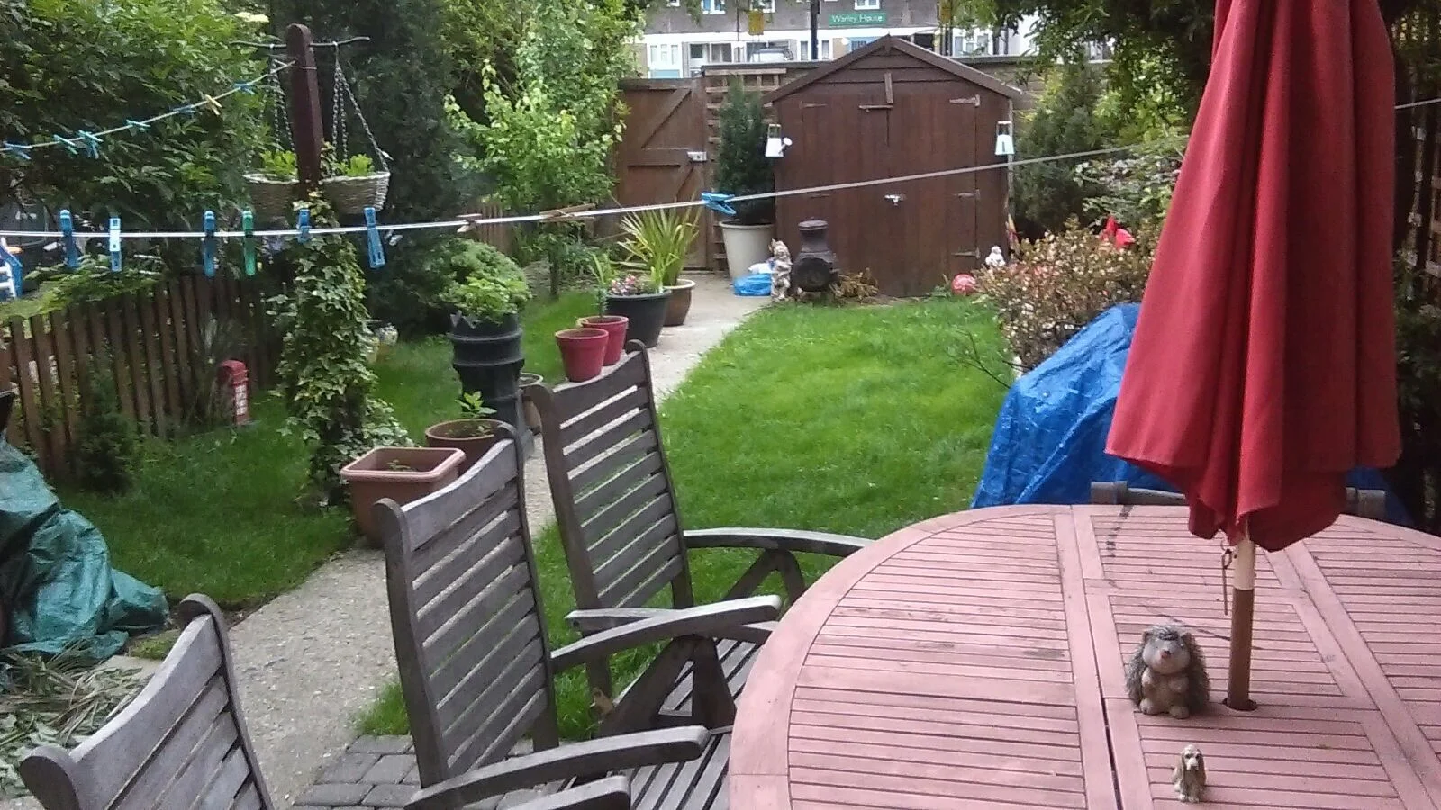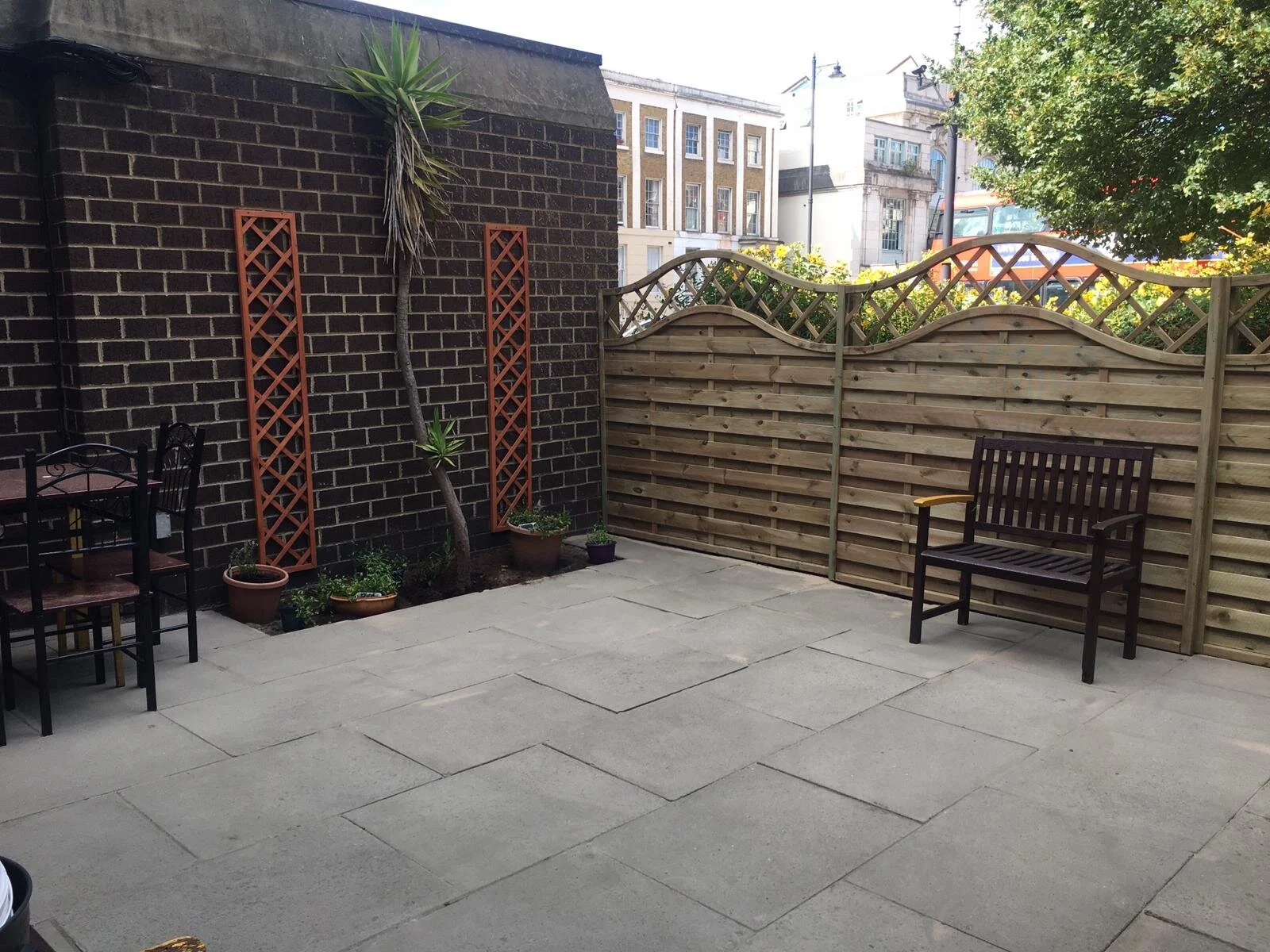 After - paving slabs jetwashed and repaved. New fence installed. Grow area created with added trellises.